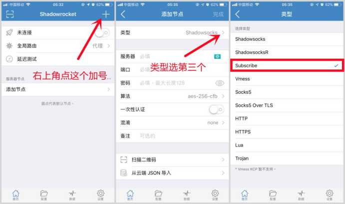 软件支持直接使用机场订阅链接来添加节点信息,如下图所示点击软件主界面左上角 ➕ 按钮,在弹出窗口进入添加节点界面,类型选择 Subscrube 后,出现节点订阅配置界面,在 URL 处输入订阅地址,备注可选自己能记住识别的内容,然后点击保存,如下图所示。