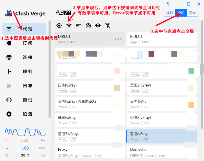 3.选中上一步导入的配置,点击 代理 → 展开 选择节点 分组 → 点击 测试可用性按钮 → 选择一个可用节点。